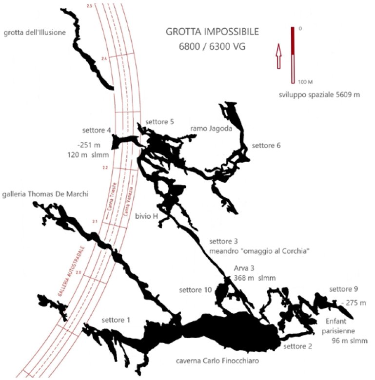 La cavità di maggior sviluppo è la Grotta Impossibile (6800/6300VG) che presenta, attualmente, uno sviluppo di 4.479 m (planimetrico 5.609 m) con profondità di 275 m, accessibile da tre ingressi (Fig. 2). La grotta è stata oggetto di studi sulla geomorfologia (Visintin et al., 2005; Cucchi et al., 2007; Visintin, 2007, 2010; Cucchi & Visintin, 2008). Di minore sviluppo è la Grotta I nella cava della Soc. Italcementi S.p.A. (2428/4841VG, denominata impropriamente nel catasto Grotta Mary) con 868 m, attualmente distrutta dai lavori di cava, di cui disponiamo di studi sulla geomeccanica dei fenomeni di frana interni e sull’evoluzione geomorfologia (Semeraro, 1975, 1979, 1994). Di notevole interesse, poiché rappresenta una tipica struttura carsica verticale dell’area, è l’Abisso sopra Chiusa (5/116VG) profondo 193 m (dal nuovo rilievo topografico) su cui sono stati eseguiti studi geomorfologici (Maucci, 1953; Forti & Forti, 1985). Anche altre cavità, minori, sono state prese in considerazioni, come la Grotta Nera (43/140VG), pure essa oggetto di uno studio geomorfologico (Anselmi & Semeraro, 2002). Inoltre, sono state eseguite indagini mineralogiche su alcuni particolari depositi della Grotta Impossibile (Merlak, 2018). Sempre nell’area è stata eseguita una prospezione gravimetrica (Korais, 2015; Korais et al., 2016) soprastante la grande Caverna Finocchiaro nella Grotta Impossibile, determinandone l’unicità, almeno attorno ai confini della medesima. Da ricordare poi come una prospezione gravimetrica del Carso sud-orientale (Morelli, 1954) abbia evidenziato tra le isoanomale di Bouguer un deficit esattamente nella medesima località. Esso, poi, fa parte di una serie di anomalie negative, con un orientamento grossomodo SE-NW, che si chiudono contro il ciglione del Carso all’altezza del paese di Moccò.
