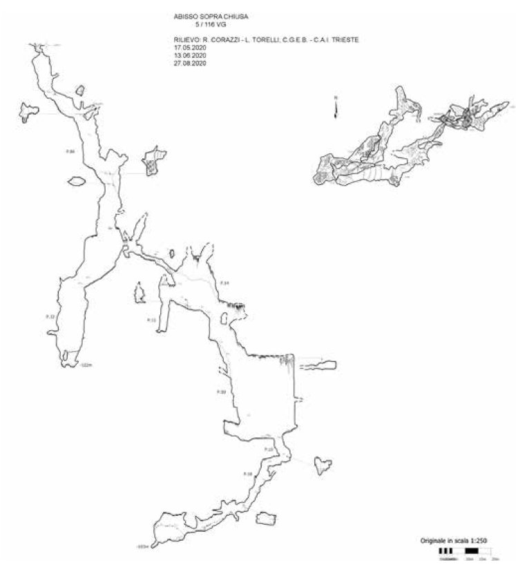 Vale la pena di esplicitare alcune note storiche, di sintesi, peraltro in parte già riportate da Marini (2010). Nel quadro della ricerca di fonti di approvvigionamento idrico per la città di Trieste in un documento datato 29 settembre 1835 l’ingegnere Giuseppe Sforzi del Comune di Trieste informava il Civico Magistrato in merito all’esistenza della bocca di una profonda grotta in località Klutsch superiore (Chiusa), segnalata dai locali che raccontavano di voci popolari circa rumori d’acqua provenienti dopo le piogge. Rintracciata la bocca durante un sopralluogo, dal lancio di sassi nel pozzo con cui iniziava Sforzi stimò una profondità di 350 piedi (107 metri), esprimendo parere negativo per un interesse nella prospettiva citata. Sempre per iniziativa di Sforzi, sembra che dopo la scoperta del Timavo nella Grotta di Trebiciano nel 1842 l’ispettore dei pompieri Giorgio Sigon si calasse nel pozzo di Klutsch, senza raggiungere il fondo, fermandosi, per ragioni di sicurezza, quando dall’esterno non si poté più udire il suono della cornetta che portava appresso. L’esplorazione vera e propria avvenne nel 1894 con i giovani del circolo tedesco a Trieste Hades Verein, ma il fondo fu raggiunto nella loro terza discesa quando ormai erano passati al Club Touristi Triestini dove trovarono, da studenti, il loro professore Ludwig Karl Mo-ser (Flego & Rupel, 2012). Eseguirono un rilievo topografico cha dava una profondità di 239 metri. Rare, sembra, siano state le esplorazioni successive. Nel periodo tra le due guerre mondiali si ha conoscenza di un’esplorazione del 1929 da parte dell’Associazione XXX Ottobre di Trieste, con intento dichiarato di documentazione. Dall’articolo giornalistico (Prez, 1929) risulterebbe sia stato effettuato un rilevamento topografico (che riteniamo andato poi perduto) il quale assegnava una profondità di 225 metri; interessante è la descrizione della galleria terminale, all’epoca ancora molto ricca di stalattiti (oggi non ci sono più) e di piccoli bacini d’acqua. Discutendo sulle acque che s’infiltrano in questa zona del Carso, Cesare Prez ipotizzava come gran parte di esse si dirigessero verso la Val Rosandra posta 2,5 km a SE. L’abisso perse d’interesse fino al 1951 quando Walter Maucci nel corso delle sue ricerche sugli inghiottitoi fossili del carso Triestino con la neocostituita Sezione Geo-speleologica della Società Adriatica di Scienze Naturali (Trieste) (SAS) lo ridiscese, studiando le caratteristiche geomorfologiche ed eseguendo un nuovo rilievo, abbassando la profondità a 223 metri (Maucci, 1953). Seguì un rilievo topografico del 1981 di Bagliani, Coren e Lazzarini, sempre come SAS, che ripropose la stessa profondità e la medesima lunghezza del precedente rilievo (140 metri). I tre rilievi topografici citati differiscono uno dall’altro nella planimetria.