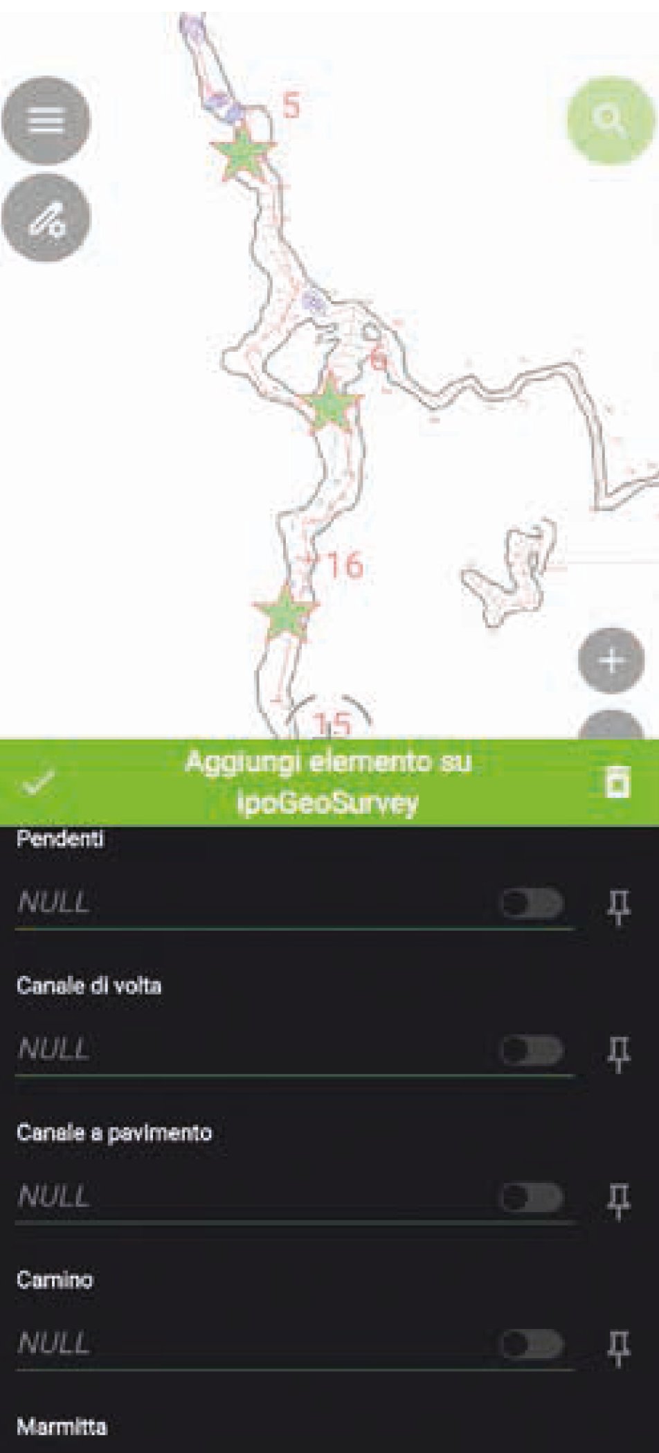 A questo punto, si dovrà creare un layer vettoriale (di tipo “point”) oppure un Geo Package e definire i dati che si vogliono registrare per ogni punto che verrà istanziato sulla mappa della grotta. Tali dati potrebbero essere dei campi testuali o numerici, delle spunte oppure degli allegati (per esempio una foto). La creazione di questo tracciato record viene operata da interfaccia, senza che ci sia la necessità di scrivere codice software.