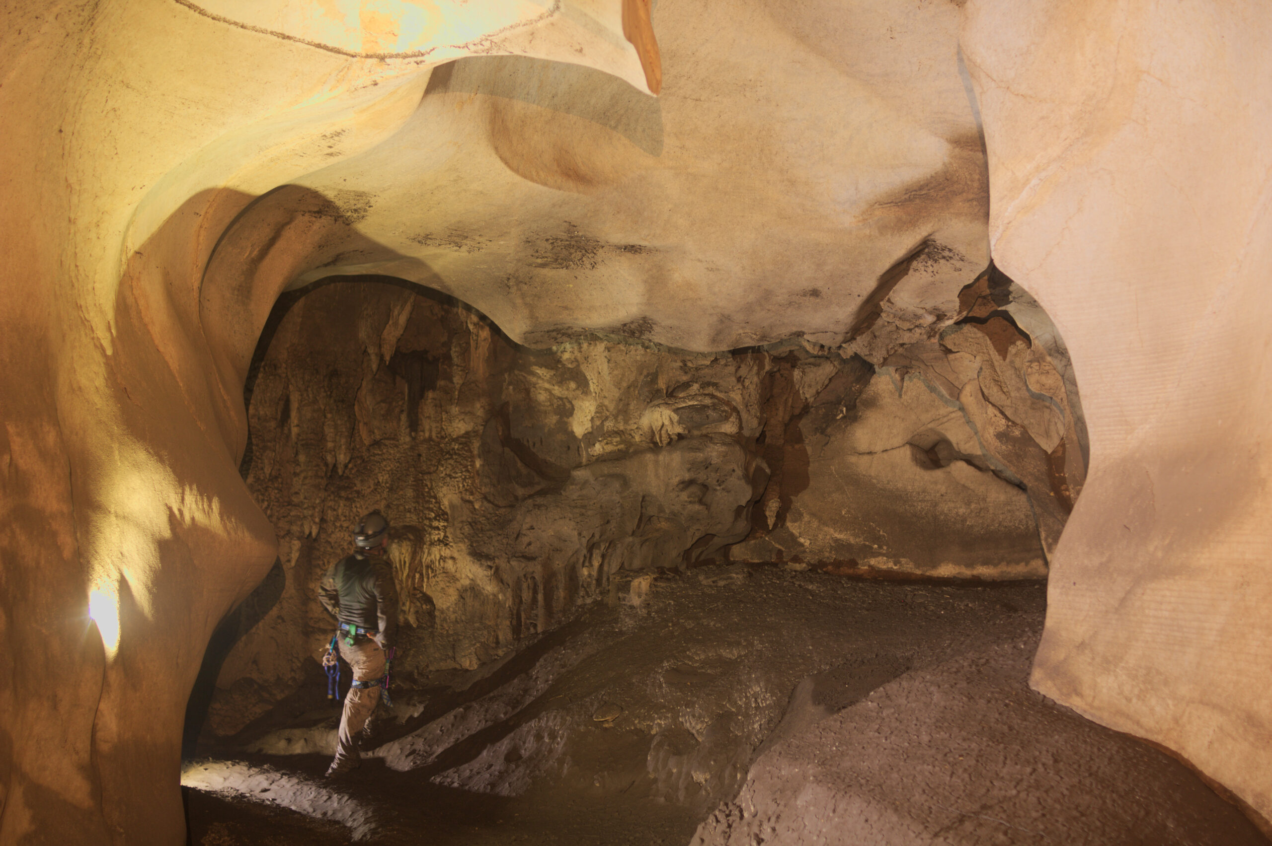 Attrezzate pertanto due linee di calata stile soccorso, si inizia la discesa constando che il fondo del pozzo, dichiarato dagli Argentini allagato, questa volta è completamente asciutto facendo ben sperare. Finite le foto dei rami superiori ed il rilievo, ci troviamo tutti sul fondo per iniziare l’explo dei due rami di una bella galleria freatica più ampia verso NORD e stretta e meandriforme verso SUD con il fondo in entrambi i rami ricoperto da una argilla morbida e collosa che ti si appiccica dappertutto. Mentre verso NORD il buon Cavia si infila in zone sempre più invase dall’argilla fino a desistere dall’iniziativa ma rilevando oltre 90 mt di nuova grotta, verso SUD seguiamo la piccola galleria meandriforme, percorsa anche da un piccolo dreno d’acqua per oltre 160 m terminando in un misero lago sifone impercorribile. Recupero degli uomini e del materiale; explo finita ma non il lavoro di rilievo e documentazione fotografica che verrà ultimato il giorno dopo.