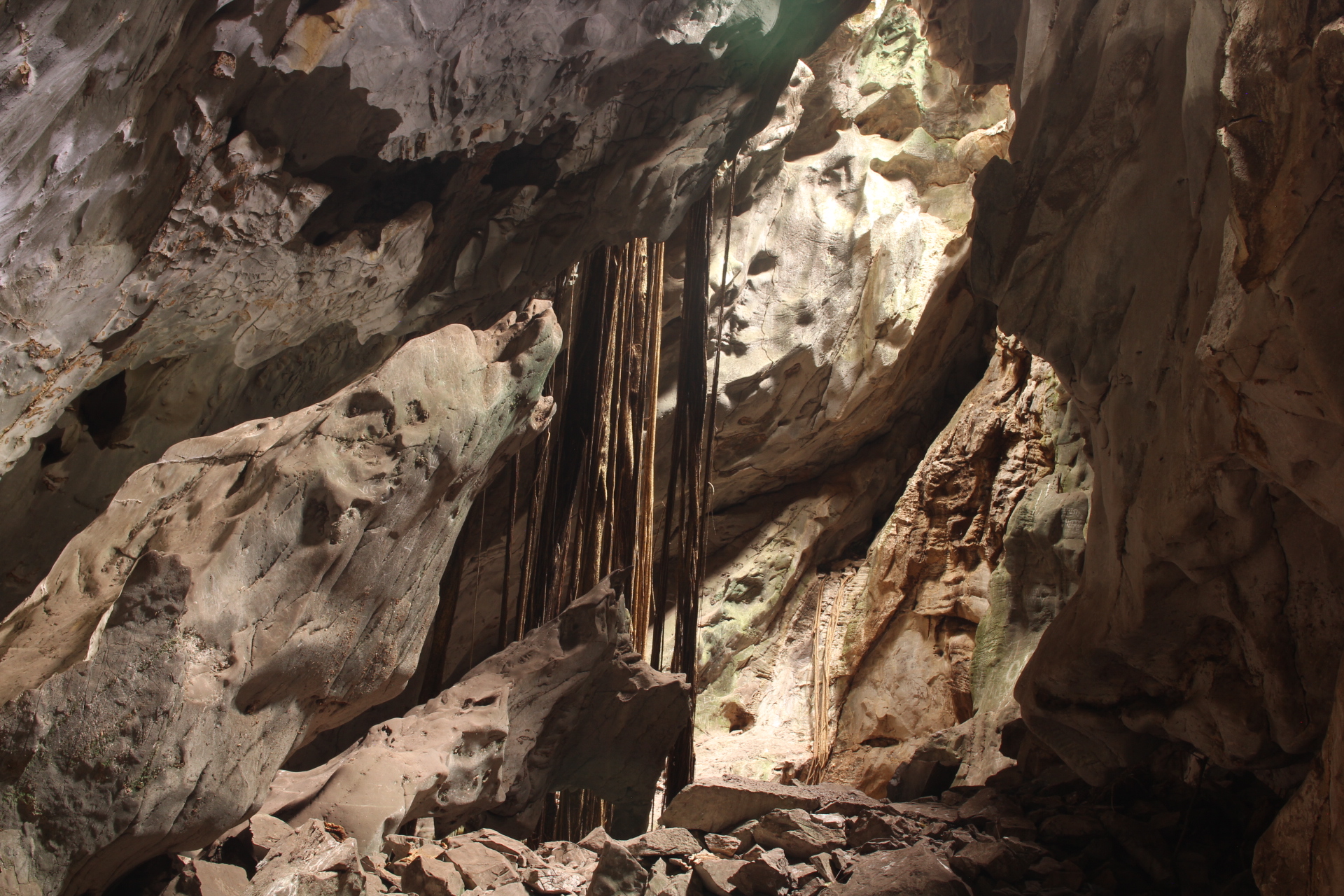 Terminata l’attività in zona, al pomeriggio ci spostiamo verso la grotta Santa Elèna per una prima ricognizione e da subito la cavità (un antico relitto di grotta con numerose finestre di crollo/erosione a soffitto) si propone come affascinante e suggestiva visto l’importante ed evidente fenomeno erosivo delle pareti ma anche per la presenza delle imponenti radici aeree dei ficus giganti (Guapo’y) che da ogni apertura si affondano nel terreno sottostante alla ricerca dell’acqua; non da meno una ricca fauna popola la grotta con nidiate di avvoltoi dal collo grigio, adulti in vigile attesa e lucertoloni in cerca di un pò di refrigerio. Insomma, uno spettacolo della natura che fa subito pensare al possibile utilizzo turistico di questa caverna considerato anche il suo facile accesso.